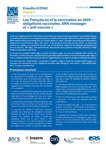 Les données de l’enquête ICOVAC Vague 5 ont été recueillies en ligne, du 1er au 24 septembre 2025, auprès d’un échantillon de 4000 personnes, représentatif de la population adulte résidant en France hexagonale selon l’âge, le sexe, la catégorie socioprofessionnelle, la taille de l’agglomération et la région de résidence (méthode des quotas).