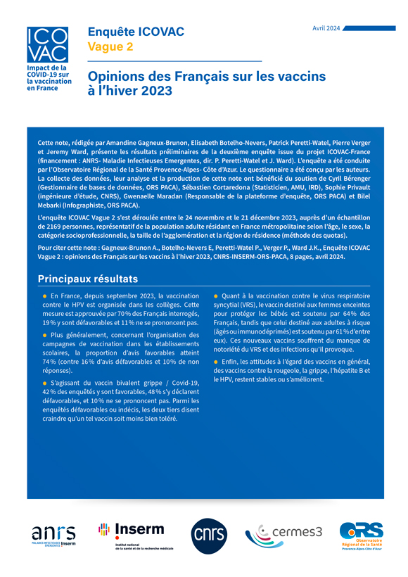 L’enquête ICOVAC Vague 2 s’est déroulée entre le 24 novembre et le 21 décembre 2023, auprès d’un échantillon de 2169 personnes, représentatif de la population adulte résidant en France métropolitaine selon l’âge, le sexe, la catégorie socioprofessionnelle, la taille de l’agglomération et la région de résidence (méthode des quotas).
