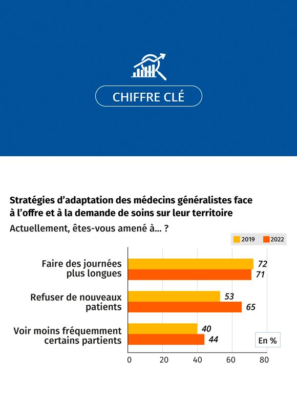 Pour s’adapter à la tension entre l’offre et la demande de soins, les médecins généralistes adaptent leurs pratiques : début 2022, 65 % des médecins déclarent être amenés à refuser de nouveaux patients comme médecin traitant ; ils étaient 53 % en 2019.